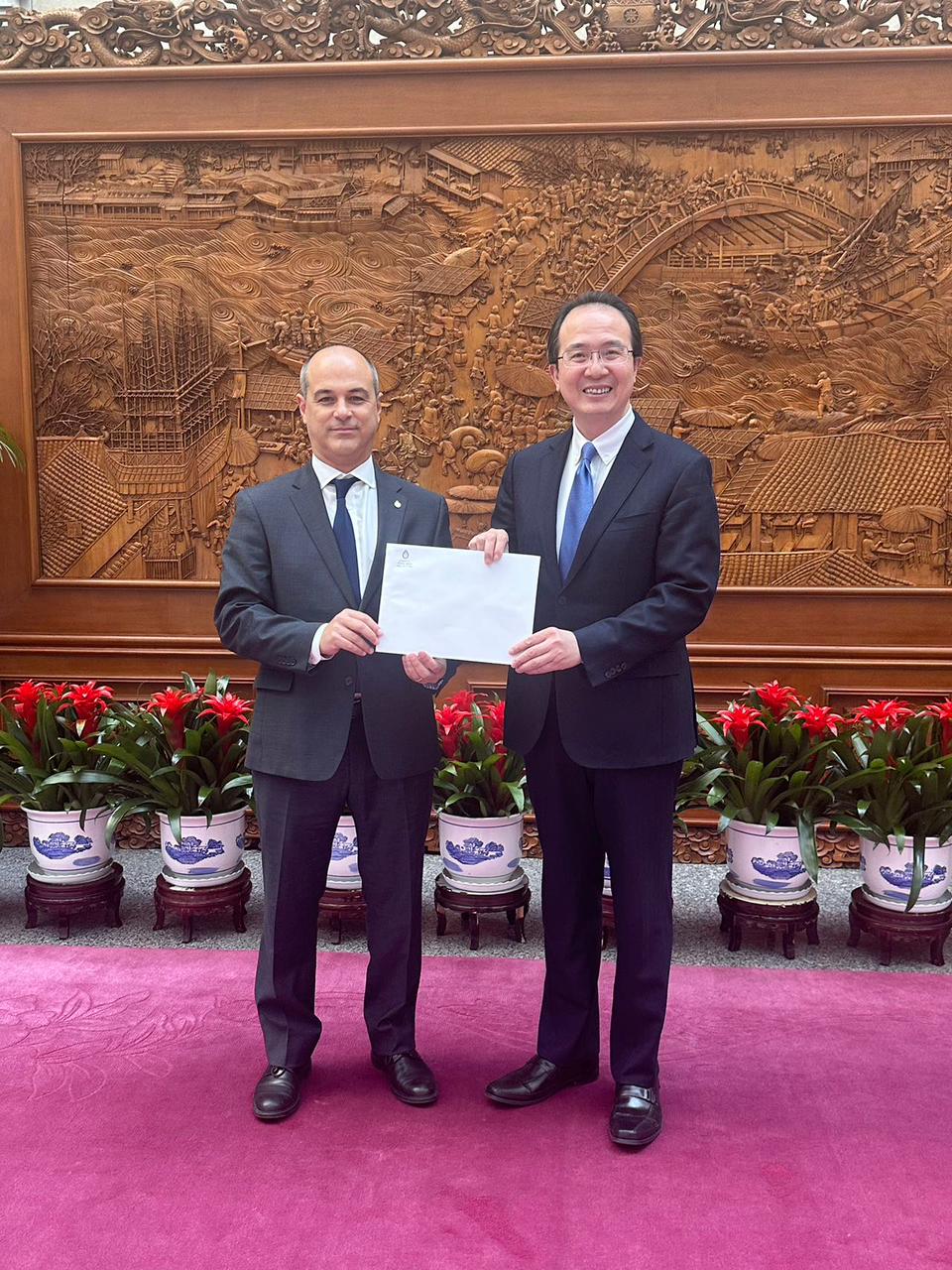 2024年3月14日,阿根廷驻华大使马致远向中华人民共和国外交部礼宾司司长洪磊递交了国书副本。
